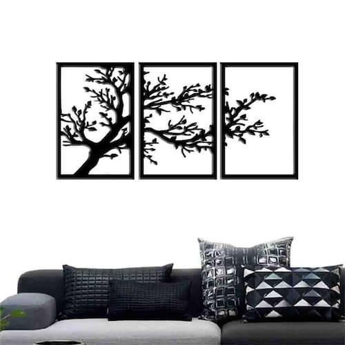 Tamanho total: 122cm comprimento x 60cm altura com espaçamento recomendado de 1 cm entre peças, Peças laterais: 60x40 cm peça central: 60x40 cm Espaçamento entre as peças: 1 cm A instalação é bem simples, não será preciso fazer sujeira furando a parede pois utilizamos o método bem prático para instalar, contém fita dupla face 3m no verso do quadro.