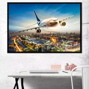 Quadro Decorativo Avião Decolando Moldura Preta e Vidro - 180x105cm -