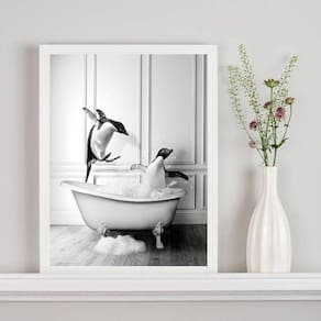 Quadro decorativo banheiro- pinguins banheira 24x18cm - com vidro Moldura: madeira branca Informações do produto tire todas as suas dúvidas no descritivo abaixo: decoração para quarto, sala, cozinha, escritório, área gourmet e muito mais. Chega de paredes vazias medidas - cada peça tem 24x18cm a5 . Material do papel - papel fotográfico brilhante de altíssima resolução acabamento - todos os quadros são acompanhados de vidro para proteção da imagem. - moldura em madeira maciça na cor preta ou branca conforme produto escolhido e pendurador . - os quadros são embalados de forma segura com plástico bolha com camada dupla de acordo com o tamanho dos quadros. Garantia - garantia de 3 meses. Meu quadro chegou. Como posso fixá-lo Você precisa apenas de um martelo e um prego, pois os quadros já vão acompanhados de penduradores. Esta é a forma mais indicada. Como posso limpar meu quadro A limpeza é feita como um móvel comum da sua casa. Apenas um pano seco ou espanador são suficientes para tal