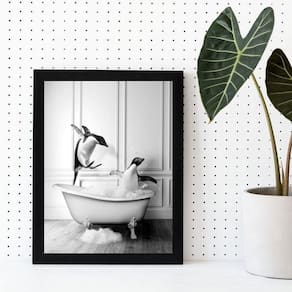 Quadro decorativo banheiro- pinguins banheira 45x34cm - com vidro Moldura: madeira preta Informações do produto tire todas as suas dúvidas no descritivo abaixo: decoração para quarto, sala, cozinha, escritório, área gourmet e muito mais. Chega de paredes vazias medidas - cada peça tem 45x34cm a3 . Material do papel - papel fotográfico brilhante de altíssima resolução acabamento - todos os quadros são acompanhados de vidro para proteção da imagem. - moldura em madeira maciça na cor preta ou branca conforme produto escolhido e pendurador . - os quadros são embalados de forma segura com plástico bolha com camada dupla de acordo com o tamanho dos quadros. Garantia - garantia de 3 meses. Meu quadro chegou. Como posso fixá-lo Você precisa apenas de um martelo e um prego, pois os quadros já vão acompanhados de penduradores. Esta é a forma mais indicada. Como posso limpar meu quadro A limpeza é feita como um móvel comum da sua casa. Apenas um pano seco ou espanador são suficientes para tal