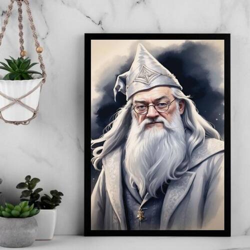 Quadro decorativo bruxo dumbledore 24x18cm - com vidro Cor: moldura branca Informações do produto tire todas as suas dúvidas no descritivo abaixo: decoração para quarto, sala, cozinha, escritório, área gourmet e muito mais. Chega de paredes vazias medidas - cada peça tem 24x18cm a5 . Material do papel - papel fotográfico brilhante de altíssima resolução acabamento - todos os quadros são acompanhados de vidro para proteção da imagem. - moldura em madeira maciça na cor preta ou branca conforme produto escolhido e pendurador . - os quadros são embalados de forma segura com plástico bolha com camada dupla de acordo com o tamanho dos quadros. Garantia - garantia de 3 meses. Meu quadro chegou. Como posso fixá-lo Você precisa apenas de um martelo e um prego, pois os quadros já vão acompanhados de penduradores. Esta é a forma mais indicada. Como posso limpar meu quadro A limpeza é feita como um móvel comum da sua casa. Apenas um pano seco ou espanador são suficientes para tal Ean: 7891234552761