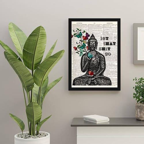 Quadro Decorativo Buda Let That Shit Go - Tamanho: A4 (20 x 30) / Acabamento: Película de acetato / Moldura: Madeira preta