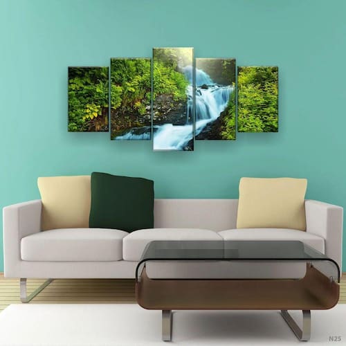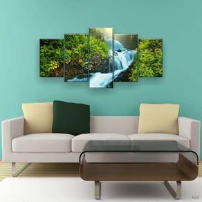 Quadro Decorativo Cachoeira Árvores 5pc 129x61 Sala Quarto