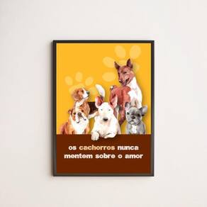 Com o Quadro Decorativo da Quadros On-Line você transforma a decoração do seu ambiente, com beleza e bom gosto. Preencha aquela parede vazia com um quadro de alta qualidade, papel fotográfico brilhante de altíssima resolução e moldura em madeira maciça. Para maior proteção, a peça ainda conta com uma película de acetato. Características: - Papel fotográfico brilhante de altíssima resolução - Película de acetato para proteção da imagem - Moldura em madeira maciça - Pendurador móvel que pode ser retirado facilmente - Pode ser fixado com fita dupla face Especificações técnicas Marca: Quadros On-Line Modelo: Cachorros Nunca Mentem Sobre O Amor Material: Papel fotográfico brilhante Acabamento: Película de acetato Moldura: Madeira Cor moldura: Preto Tamanho: 45 x 34 cm A3 Fixação: Prego ou fita dupla face de alta qualidade Acompanha pendurador: Sim Conteúdo: 01 Quadro Decorativo : 3 meses Dica de limpeza A limpeza é feita como um móvel comum da sua casa. Apenas um pano seco ou espanador são suficientes para tal. Marca: Não Informado
