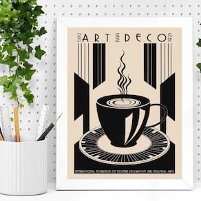 Quadro decorativo café - art deco 24x18cm - com vidro Cor: moldura branca Informações do produto tire todas as suas dúvidas no descritivo abaixo: decoração para quarto, sala, cozinha, escritório, área gourmet e muito mais. Chega de paredes vazias medidas - cada peça tem 24x18cm a5 . Material do papel - papel fotográfico brilhante de altíssima resolução acabamento - todos os quadros são acompanhados de vidro para proteção da imagem. - moldura em madeira maciça na cor preta ou branca conforme produto escolhido e pendurador . - os quadros são embalados de forma segura com plástico bolha com camada dupla de acordo com o tamanho dos quadros. Garantia - garantia de 3 meses. Meu quadro chegou. Como posso fixá-lo Você precisa apenas de um martelo e um prego, pois os quadros já vão acompanhados de penduradores. Esta é a forma mais indicada. Como posso limpar meu quadro A limpeza é feita como um móvel comum da sua casa. Apenas um pano seco ou espanador são suficientes para tal