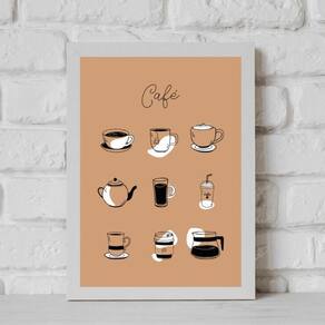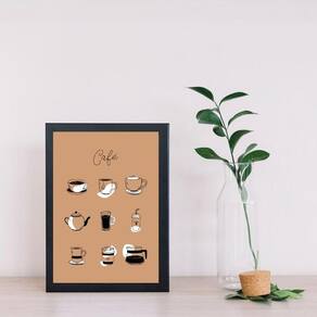 Quadro decorativo café - desenhos 24x18cm - com vidro Cor: moldura preta Informações do produto tire todas as suas dúvidas no descritivo abaixo: decoração para quarto, sala, cozinha, escritório, área gourmet e muito mais. Chega de paredes vazias medidas - cada peça tem 24x18cm a5 . Material do papel - papel fotográfico brilhante de altíssima resolução acabamento - todos os quadros são acompanhados de vidro para proteção da imagem. - moldura em madeira maciça na cor preta ou branca conforme produto escolhido e pendurador . - os quadros são embalados de forma segura com plástico bolha com camada dupla de acordo com o tamanho dos quadros. Garantia - garantia de 3 meses. Meu quadro chegou. Como posso fixá-lo Você precisa apenas de um martelo e um prego, pois os quadros já vão acompanhados de penduradores. Esta é a forma mais indicada. Como posso limpar meu quadro A limpeza é feita como um móvel comum da sua casa. Apenas um pano seco ou espanador são suficientes para tal