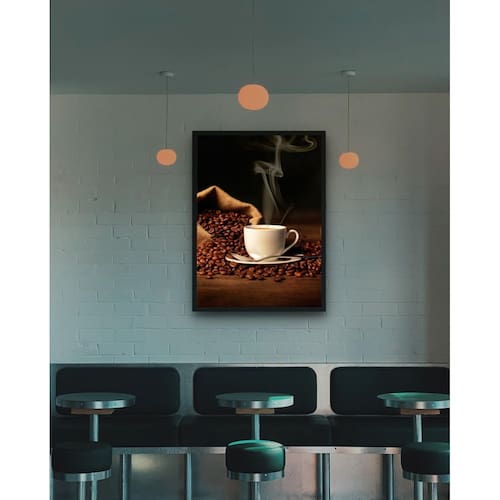 Quadro decorativo café quente saco grãos - 70x50cm Cor: moldura preta Informações do produto tire todas as suas dúvidas no descritivo abaixo: decoração para quarto, sala, cozinha, escritório, área gourmet e muito mais. Chega de paredes vazias medidas - cada peça tem 70x50cm . Material do papel - papel fotográfico brilhante de altíssima resolução acabamento - todos os quadros são acompanhados de vidro para proteção da imagem. - moldura em madeira maciça na cor preta ou branca conforme produto escolhido e pendurador. - os quadros são embalados de forma segura com plástico bolha com camada dupla de acordo com o tamanho dos quadros. - de 3 meses. Meu quadro chegou. Como posso fixá-lo Você precisa apenas de um martelo e um prego, pois os quadros já vão acompanhados de penduradores. Esta é a forma mais indicada. Como posso limpar meu quadro A limpeza é feita como um móvel comum da sua casa. Apenas um pano seco ou espanador são suficientes para tal Marca: Não Informado
