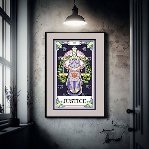 Quadro decorativo carta tarot justiça gato - 60x48cm Moldura: madeira branca Informações do produto tire todas as suas dúvidas no descritivo abaixo: decoração para quarto, sala, cozinha, escritório, área gourmet e muito mais. Chega de paredes vazias medidas - cada peça tem 60x48cm . Material do papel - papel fotográfico brilhante de altíssima resolução acabamento - todos os quadros são acompanhados de vidro para proteção da imagem. - moldura em madeira maciça na cor preta ou branca conforme produto escolhido e pendurador. - paspatur branco com 7cm de largura - os quadros são embalados de forma segura com plástico bolha com camada dupla de acordo com o tamanho dos quadros. Garantia - garantia de 3 meses. Meu quadro chegou. Como posso fixá-lo Você precisa apenas de um martelo e um prego, pois os quadros já vão acompanhados de penduradores. Esta é a forma mais indicada. Como posso limpar meu quadro A limpeza é feita como um móvel comum da sua casa. Apenas um pano seco ou espanador são suficientes para tal Ean: 7894374675437