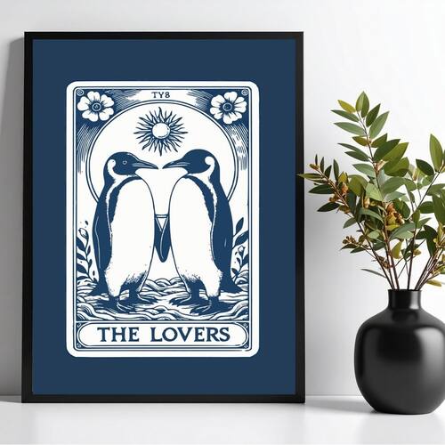 Quadro Decorativo Carta Tarot - Pinguins 45x34cm - com vidro - Cor: Moldura preta