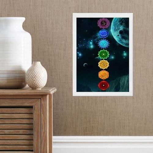 Quadro decorativo chakras - universo 24x18cm - com vidro Moldura: madeira branca Informações do produto tire todas as suas dúvidas no descritivo abaixo: decoração para quarto, sala, cozinha, escritório, área gourmet e muito mais. Chega de paredes vazias medidas - cada peça tem 24x18cm a5 . Material do papel - papel fotográfico brilhante de altíssima resolução acabamento - todos os quadros são acompanhados de vidro para proteção da imagem. - moldura em madeira maciça na cor preta ou branca conforme produto escolhido e pendurador . - os quadros são embalados de forma segura com plástico bolha com camada dupla de acordo com o tamanho dos quadros. Garantia - garantia de 3 meses. Meu quadro chegou. Como posso fixá-lo Você precisa apenas de um martelo e um prego, pois os quadros já vão acompanhados de penduradores. Esta é a forma mais indicada. Como posso limpar meu quadro A limpeza é feita como um móvel comum da sua casa. Apenas um pano seco ou espanador são suficientes para tal