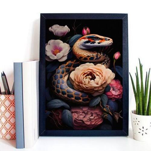 Quadro decorativo cobra com flores 33x24cm Moldura: madeira preta Informações do produto tire todas as suas dúvidas no descritivo abaixo: decoração para quarto, sala, cozinha, escritório, área gourmet e muito mais. Chega de paredes vazias medidas - cada peça tem 33x24cm a4 . Material do papel - papel fotográfico brilhante de altíssima resolução acabamento - todos os quadros são acompanhados de uma película de acetato para proteção da imagem. - os quadros são embalados de forma segura com plástico bolha com camada dupla de acordo com o tamanho dos quadros. - de 3 meses. Meu quadro chegou. Como posso fixá-lo Você precisa apenas de um martelo e um prego, pois os quadros já vão acompanhados de penduradores. Esta é a forma mais indicada. Caso prefira, você pode utilizar uma fita dupla face neste caso, sugerimos de alta qualidade para evitar que descole e seu quadro caia . Como posso limpar meu quadro A limpeza é feita como um móvel comum da sua casa. Apenas um pano seco ou espanador são suficientes para tal Ean: 7898770443379