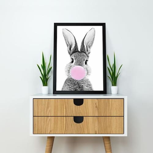Quadro decorativo coelho chiclete 45x34cm Moldura: madeira preta Informações do produto tire todas as suas dúvidas no descritivo abaixo: decoração para quarto, sala, cozinha, escritório, área gourmet e muito mais. Chega de paredes vazias. Medidas - cada peça tem 45x34cm a3 . Material do papel - papel fotográfico brilhante de altíssima resolução acabamento - todos os quadros são acompanhados de uma película de acetato para proteção da imagem. - os quadros são embalados de forma segura com plástico bolha com camada dupla de acordo com o tamanho dos quadros. - de 3 meses. Meu quadro chegou. Como posso fixá-lo Você precisa apenas de um martelo e um prego, pois os quadros já vão acompanhados de penduradores. Esta é a forma mais indicada. Caso prefira, você pode utilizar uma fita dupla face neste caso, sugerimos de alta qualidade para evitar que descole e seu quadro caia . Como posso limpar meu quadro A limpeza é feita como um móvel comum da sua casa. Apenas um pano seco ou espanador são suficientes para tal