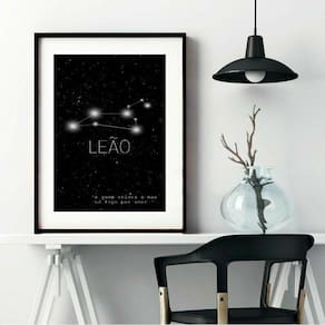 Quadro decorativo constelação signo leão - 60x48cm Moldura: madeira preta Informações do produto tire todas as suas dúvidas no descritivo abaixo: decoração para quarto, sala, cozinha, escritório, área gourmet e muito mais. Chega de paredes vazias medidas - cada peça tem 60x48cm . Material do papel - papel fotográfico brilhante de altíssima resolução acabamento - todos os quadros são acompanhados de vidro para proteção da imagem. - moldura em madeira maciça na cor preta ou branca conforme produto escolhido e pendurador. - paspatur branco com 7cm de largura - os quadros são embalados de forma segura com plástico bolha com camada dupla de acordo com o tamanho dos quadros. Garantia - garantia de 3 meses. Meu quadro chegou. Como posso fixá-lo Você precisa apenas de um martelo e um prego, pois os quadros já vão acompanhados de penduradores. Esta é a forma mais indicada. Como posso limpar meu quadro A limpeza é feita como um móvel comum da sua casa. Apenas um pano seco ou espanador são suficientes para tal Ean: 7897633158900