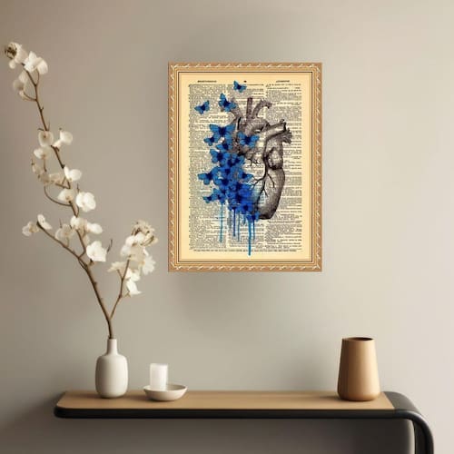Quadro decorativo coração borboletas azuis vintage 33x24cm - com vidro Cor: moldura preta Informações do produto tire todas as suas dúvidas no descritivo abaixo: decoração para quarto, sala, cozinha, escritório, área gourmet e muito mais. Chega de paredes vazias medidas - cada peça tem 33x24cm a4 . Material do papel - papel fotográfico brilhante de altíssima resolução acabamento - todos os quadros são acompanhados de vidro para proteção da imagem. - moldura em madeira maciça na cor preta ou branca conforme produto escolhido e pendurador . - os quadros são embalados de forma segura com plástico bolha com camada dupla de acordo com o tamanho dos quadros. Garantia - garantia de 3 meses. Meu quadro chegou. Como posso fixá-lo Você precisa apenas de um martelo e um prego, pois os quadros já vão acompanhados de penduradores. Esta é a forma mais indicada. Como posso limpar meu quadro A limpeza é feita como um móvel comum da sua casa. Apenas um pano seco ou espanador são suficientes para tal