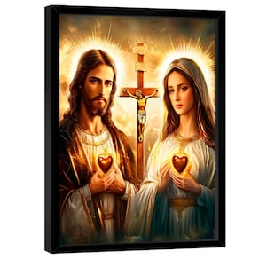 Quadro Decorativo Coração de Jesus e Mari Moldura Preta - 84x54cm -