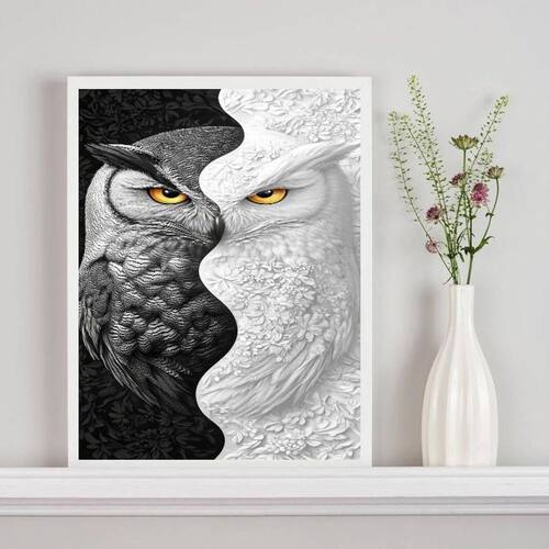 Quadro Decorativo Coruja Branco Preto - Metades 24X18Cm