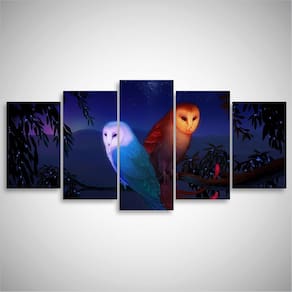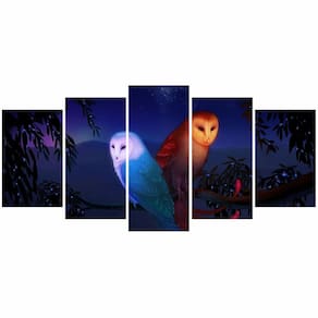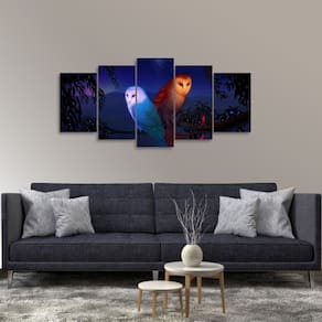 Quadro decorativo Corujas Paisagem Dimensões do Produto: Tamanho total do produto: 125x60 cm Comprimento x Altura 02 Peças menores: 25x40 cm 02 Peças Médias: 25x50 cm 01 Peça Central: 25x60 cm. Espaçamento entre as peças de 1 cm - Tamanho total com espaçamentos 129x60 cm. Espessura do produto - 9 mm