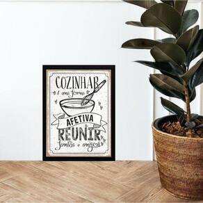 Quadro decorativo cozinha afetiva 24x18cm Moldura: madeira preta Informações do produto tire todas as suas dúvidas no descritivo abaixo: decoração para quarto, sala, cozinha, escritório, área gourmet e muito mais. Chega de paredes vazias medidas - cada peça tem 24x18cm a5 . Material do papel - papel fotográfico brilhante de altíssima resolução acabamento - todos os quadros são acompanhados de uma película de acetato para proteção da imagem. - os quadros são embalados de forma segura com plástico bolha com camada dupla de acordo com o tamanho dos quadros. Garantia - garantia de 3 meses. Meu quadro chegou. Como posso fixá-lo Você precisa apenas de um martelo e um prego, pois os quadros já vão acompanhados de penduradores. Esta é a forma mais indicada. Caso prefira, você pode utilizar uma fita dupla face neste caso, sugerimos de alta qualidade para evitar que descole e seu quadro caia . Como posso limpar meu quadro A limpeza é feita como um móvel comum da sua casa. Apenas um pano seco ou espanador são suficientes para tal