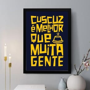 Quadro decorativo cuscuz é melhor que muita gente 33x24cm - com vidro Cor: moldura preta Informações do produto tire todas as suas dúvidas no descritivo abaixo: decoração para quarto, sala, cozinha, escritório, área gourmet e muito mais. Chega de paredes vazias medidas - cada peça tem 33x24cm a4 . Material do papel - papel fotográfico brilhante de altíssima resolução acabamento - todos os quadros são acompanhados de vidro para proteção da imagem. - moldura em madeira maciça na cor preta ou branca conforme produto escolhido e pendurador . - os quadros são embalados de forma segura com plástico bolha com camada dupla de acordo com o tamanho dos quadros. Garantia - garantia de 3 meses. Meu quadro chegou. Como posso fixá-lo Você precisa apenas de um martelo e um prego, pois os quadros já vão acompanhados de penduradores. Esta é a forma mais indicada. Como posso limpar meu quadro A limpeza é feita como um móvel comum da sua casa. Apenas um pano seco ou espanador são suficientes para tal