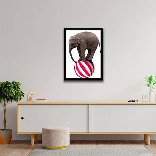 Quadro Decorativo Decorativo Elefante em Cima da Bola - Tamanho: A4 (20 x 30) / Acabamento: Película de acetato / Moldura: Madeira preta
