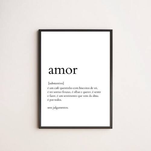 Quadro decorativo definição de amor 45x34cm - com vidro Moldura: madeira preta Informações do produto tire todas as suas dúvidas no descritivo abaixo: decoração para quarto, sala, cozinha, escritório, área gourmet e muito mais. Chega de paredes vazias medidas - cada peça tem 45x34cm a3 . Material do papel - papel fotográfico brilhante de altíssima resolução acabamento - todos os quadros são acompanhados de vidro para proteção da imagem. - moldura em madeira maciça na cor preta e pendurador . - os quadros são embalados de forma segura com plástico bolha com camada dupla de acordo com o tamanho dos quadros. Garantia - garantia de 3 meses. Meu quadro chegou. Como posso fixá-lo Você precisa apenas de um martelo e um prego, pois os quadros já vão acompanhados de penduradores. Esta é a forma mais indicada. Como posso limpar meu quadro A limpeza é feita como um móvel comum da sua casa. Apenas um pano seco ou espanador são suficientes para tal