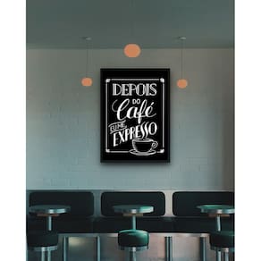 Quadro decorativo depois do café eu me expresso - 70x50cm Cor: moldura preta Informações do produto tire todas as suas dúvidas no descritivo abaixo: decoração para quarto, sala, cozinha, escritório, área gourmet e muito mais. Chega de paredes vazias medidas - cada peça tem 70x50cm . Material do papel - papel fotográfico brilhante de altíssima resolução acabamento - todos os quadros são acompanhados de vidro para proteção da imagem. - moldura em madeira maciça na cor preta ou branca conforme produto escolhido e pendurador. - os quadros são embalados de forma segura com plástico bolha com camada dupla de acordo com o tamanho dos quadros. - de 3 meses. Meu quadro chegou. Como posso fixá-lo Você precisa apenas de um martelo e um prego, pois os quadros já vão acompanhados de penduradores. Esta é a forma mais indicada. Como posso limpar meu quadro A limpeza é feita como um móvel comum da sua casa. Apenas um pano seco ou espanador são suficientes para tal Marca: Não Informado Ean: 7901039770526