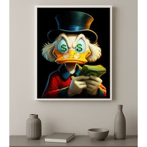 Quadro Decorativo Dinheiro - Pato Rico Com Dólares 24x18cm - com vidro - Cor: Moldura branca