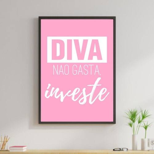Quadro Decorativo Diva Não Gasta, Investe! Rosa - Tamanho: A4 (20 x 30) / Acabamento: Película de acetato / Moldura: Madeira preta