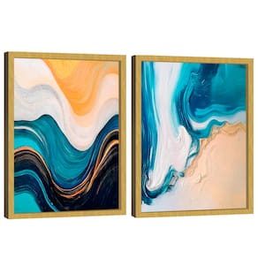Quadro Decorativo Duo Abstrato Ondas Suave Moldura Dourada - 118x78 -