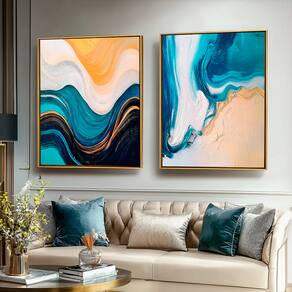 Quadro Decorativo Duo Abstrato Ondas Suave Moldura Dourada - 180x105 -