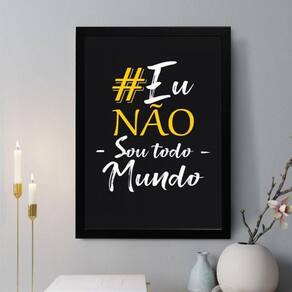 Quadro decorativo eu não sou todo mundo 45x34cm - com vidro Cor: moldura preta Informações do produto tire todas as suas dúvidas no descritivo abaixo: decoração para quarto, sala, cozinha, escritório, área gourmet e muito mais. Chega de paredes vazias medidas - cada peça tem 45x34cm a3 . Material do papel - papel fotográfico brilhante de altíssima resolução acabamento - todos os quadros são acompanhados de vidro para proteção da imagem. - moldura em madeira maciça na cor preta ou branca conforme produto escolhido e pendurador . - os quadros são embalados de forma segura com plástico bolha com camada dupla de acordo com o tamanho dos quadros. Garantia - garantia de 3 meses. Meu quadro chegou. Como posso fixá-lo Você precisa apenas de um martelo e um prego, pois os quadros já vão acompanhados de penduradores. Esta é a forma mais indicada. Como posso limpar meu quadro A limpeza é feita como um móvel comum da sua casa. Apenas um pano seco ou espanador são suficientes para tal