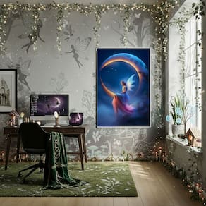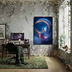 Quadro Decorativo Fada Sentada Em Uma Lua Crescente -70x50cm - Cor: Moldura Preta
