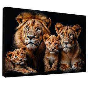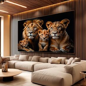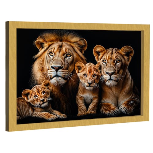 Quadro Decorativo Família de Leões no Preto Moldura Dourada - 84x54cm -
