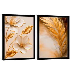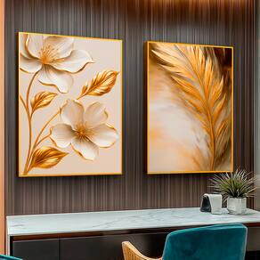 Quadro Decorativo Flor e Folha Dourada Duo Moldura Dourada - 84x54cm -