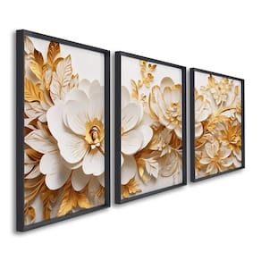 Quadro Decorativo Floral Delicado Flores Brancas e Amarelas com 3 Telas de Parede para Sala Quarto e Preto