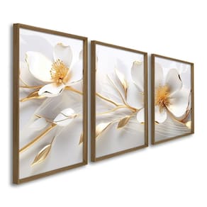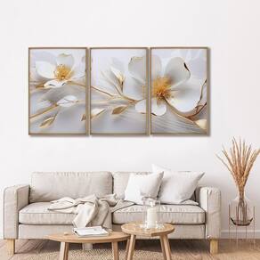 Quadro Decorativo Floral Delicado Magnólias com 3 Telas de Parede para Sala Quarto Escritório 60cm X Branco