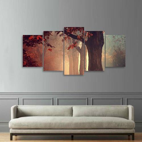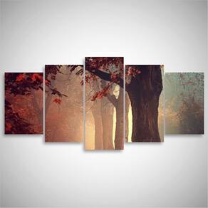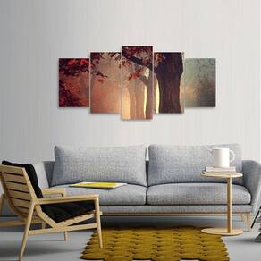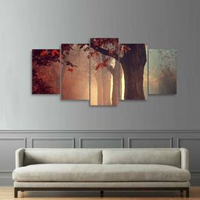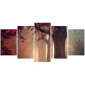 Quadro decorativo Floresta Folhas Vermelhas Dimensões do Produto: Tamanho total do produto: 125x60 cm Comprimento x Altura 02 Peças menores: 25x40 cm 02 Peças Médias: 25x50 cm 01 Peça Central: 25x60 cm. Espaçamento entre as peças de 1 cm - Tamanho total com espaçamentos 129x60 cm. Espessura do produto - 9 mm
