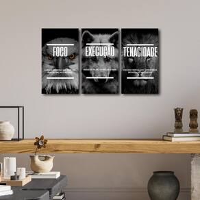 Quadro Decorativo Foco Execução Tenacidade Águia Lobo Leão Desenho: Animais Transforme o ambiente da sua casa ou escritório com nosso Quadro Triplo Decorativo de alta qualidade. Este conjunto impressionante é produzido utilizando a mais avançada tecnologia de impressão e corte a laser, garantindo detalhes nítidos e precisos que capturam a essência de qualquer imagem ou design. Características: Impressão de Alta Qualidade: Nossos quadros apresentam uma impressão de alta definição que realça cores vibrantes e detalhes minuciosos, proporcionando uma estética visualmente deslumbrante. Corte a Laser: O corte a laser oferece um acabamento perfeito e preciso, destacando contornos e formas de maneira impecável. Esta técnica também assegura bordas limpas e uniformes, valorizando ainda mais a elegância do quadro. Material Durável: Produzidos em chapa de MDF de 3 mm, os quadros são leves, resistentes e duráveis, garantindo uma longa vida útil e fácil manuseio. O MDF é um material sustentável que proporciona uma superfície lisa e uniforme para a impressão. Design Versátil: Composto por três partes que podem ser dispostas de diversas maneiras, este quadro triplo se adapta a diferentes estilos de decoração, seja moderno, clássico, minimalista ou contemporâneo. Fácil Instalação: Cada quadro vem com fita dupla face prontos para utilizar, permitindo uma instalação rápida e sem complicações. Adicione um toque de sofisticação e personalidade ao seu espaço com o nosso Quadro Triplo Decorativo. Ideal para salas de estar, quartos, escritórios e qualquer ambiente que necessite de um toque artístico e elegante.