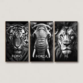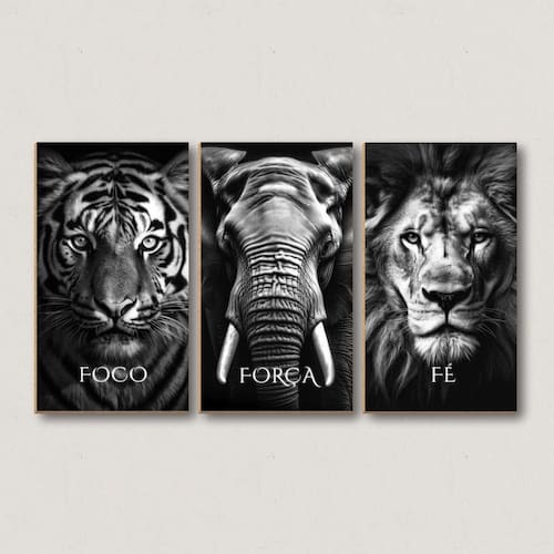 Quadro Decorativo Foco Força Fé Tigre Elefante Leão Animais Desenho: Animais Transforme o ambiente da sua casa ou escritório com nosso Quadro Triplo Decorativo de alta qualidade. Este conjunto impressionante é produzido utilizando a mais avançada tecnologia de impressão e corte a laser, garantindo detalhes nítidos e precisos que capturam a essência de qualquer imagem ou design. Características: Impressão de Alta Qualidade: Nossos quadros apresentam uma impressão de alta definição que realça cores vibrantes e detalhes minuciosos, proporcionando uma estética visualmente deslumbrante. Corte a Laser: O corte a laser oferece um acabamento perfeito e preciso, destacando contornos e formas de maneira impecável. Esta técnica também assegura bordas limpas e uniformes, valorizando ainda mais a elegância do quadro. Material Durável: Produzidos em chapa de MDF de 3 mm, os quadros são leves, resistentes e duráveis, garantindo uma longa vida útil e fácil manuseio. O MDF é um material sustentável que proporciona uma superfície lisa e uniforme para a impressão. Design Versátil: Composto por três partes que podem ser dispostas de diversas maneiras, este quadro triplo se adapta a diferentes estilos de decoração, seja moderno, clássico, minimalista ou contemporâneo. Fácil Instalação: Cada quadro vem com fita dupla face prontos para utilizar, permitindo uma instalação rápida e sem complicações. Adicione um toque de sofisticação e personalidade ao seu espaço com o nosso Quadro Triplo Decorativo. Ideal para salas de estar, quartos, escritórios e qualquer ambiente que necessite de um toque artístico e elegante.