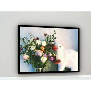 Quadro Decorativo Foto Gata Atras Vaso Flores - 70x50cm - Cor: Moldura Branca