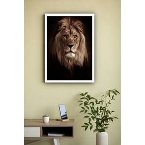 Quadro Decorativo Foto Leão Fundo Preto - 70x50cm - Cor: Moldura Branca