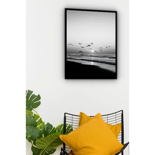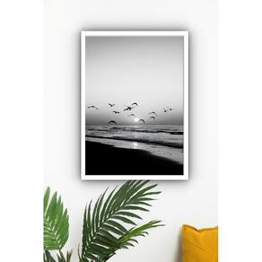 Quadro Decorativo Foto Pássaros Mar P&B - 70x50cm - Cor: Moldura Preta