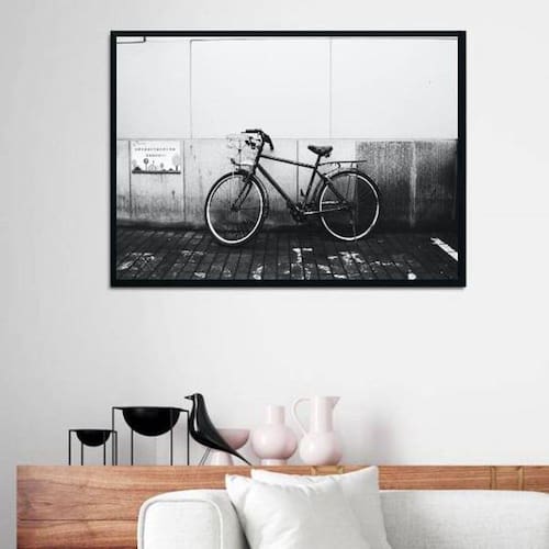Quadro Decorativo Fotografia Bicicleta Estacionada - Tamanho: A4 (20 x 30) / Acabamento: Película de acetato / Moldura: Madeira preta