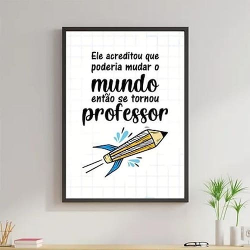 Quadro decorativo frase professor 33x24cm Moldura: madeira preta Informações do produto Decoração para quarto, sala, cozinha, escritório, área gourmet e muito mais. Chega de paredes vazias Medidas - cada peça tem 33x24cm a4 . Material do papel - papel fotográfico brilhante de altíssima resolução acabamento - Todos os quadros são acompanhados de uma película de acetato para proteção da imagem. - Os quadros são embalados de forma segura com plástico bolha com camada dupla de acordo com o tamanho dos quadros. - de 3 meses. Meu quadro chegou. Como posso fixá-lo Você precisa apenas de um martelo e um prego, pois os quadros já vão acompanhados de penduradores. Esta é a forma mais indicada. Caso prefira, você pode utilizar uma fita dupla face neste caso, sugerimos de alta qualidade para evitar que descole e seu quadro caia . Como posso limpar meu quadro A limpeza é feita como um móvel comum da sua casa. Apenas um pano seco ou espanador são suficientes para tal