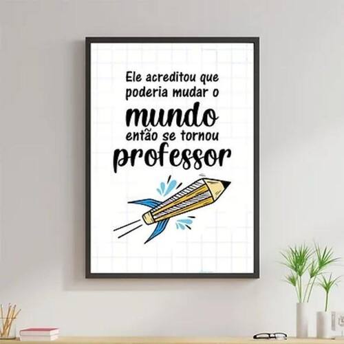 Quadro decorativo frase professor 60x40cm Moldura: madeira preta Informações do produto Decoração para quarto, sala, cozinha, escritório, área gourmet e muito mais. Chega de paredes vazias Medidas - cada peça tem 60x42cm a2 . Material do papel - papel fotográfico brilhante de altíssima resolução Acabamento - todos os quadros são acompanhados de uma película de acetato para proteção da imagem. - Os quadros são embalados de forma segura com plástico bolha com camada dupla de acordo com o tamanho dos quadros. - de 3 meses. Meu quadro chegou. Como posso fixá-lo Você precisa apenas de um martelo e um prego, pois os quadros já vão acompanhados de penduradores. Esta é a forma mais indicada. Caso prefira, você pode utilizar uma fita dupla face neste caso, sugerimos de alta qualidade para evitar que descole e seu quadro caia . Como posso limpar meu quadro A limpeza é feita como um móvel comum da sua casa. Apenas um pano seco ou espanador são suficientes para tal