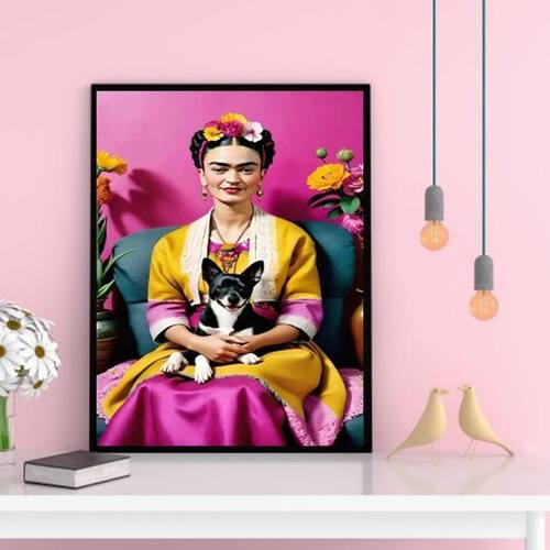 Quadro decorativo frida com cachorrinho 45x34cm - com vidro