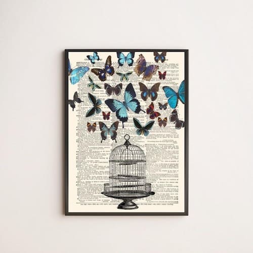 Quadro Decorativo Gaiola Com Borboletas - Acabamento: Película de acetato / Moldura: Madeira preta / Tamanho: A4 (20 X 30)