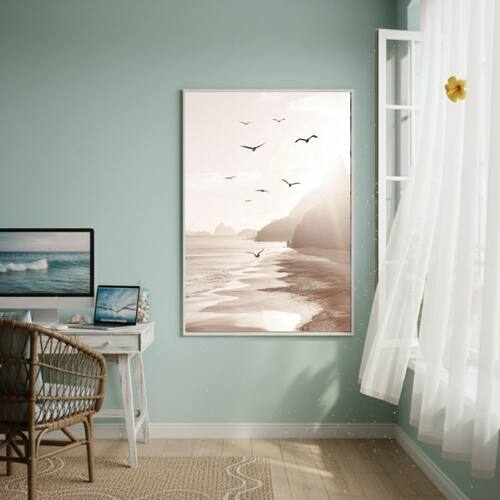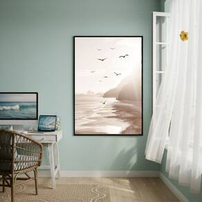 Quadro Decorativo Gaivotas Voando Na Praia-70x50cm - Cor: Moldura Preta