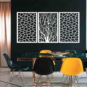 Quadro Decorativo Galhos Geométrico Branco 6Mm Vazado - Mdf TAMANHO & INSTALAÇÃO: Tamanho total: 122cm comprimento X 60cm altura Com espaçamento recomendado de 1 cm entre peças, Peças laterais: 40x60 cm | Peça central: 40x60 cm Espaçamento entre as peças: 1 cm A instalação é bem simples, não será preciso fazer sujeira furando a parede pois utilizamos o método bem prático para instalar, contém fita dupla face 3M no verso do quadro. LIMPEZA DO PRODUTO Para limpeza, utilize apenas um pano umedecido com água sem produtos químicos para garantir a durabilidade. ACABAMENTO Nossos produtos são fabricados em MDF com espessura de 6mm cortados a laser. Desta forma terá um produto com acabamento de alta qualidade. Bordas/laterais serão na cor preta feito com a própria máquina de corte a laser, dando acabamento perfeito. GARANTIA / EMBALAGEM Embalagem reforçada e segura para que receba seu produto em perfeito estado. Garantia de produto de qualidade ou seu dinheiro de volta.