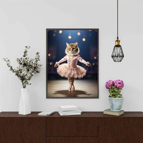 Quadro decorativo gatinha bailarina 24x18cm - com vidro Cor: moldura branca Informações do produto tire todas as suas dúvidas no descritivo abaixo: decoração para quarto, sala, cozinha, escritório, área gourmet e muito mais. Chega de paredes vazias medidas - cada peça tem 24x18cm a5 . Material do papel - papel fotográfico brilhante de altíssima resolução acabamento - todos os quadros são acompanhados de vidro para proteção da imagem. - moldura em madeira maciça na cor preta ou branca conforme produto escolhido e pendurador . - os quadros são embalados de forma segura com plástico bolha com camada dupla de acordo com o tamanho dos quadros. Garantia - garantia de 3 meses. Meu quadro chegou. Como posso fixá-lo Você precisa apenas de um martelo e um prego, pois os quadros já vão acompanhados de penduradores. Esta é a forma mais indicada. Como posso limpar meu quadro A limpeza é feita como um móvel comum da sua casa. Apenas um pano seco ou espanador são suficientes para tal